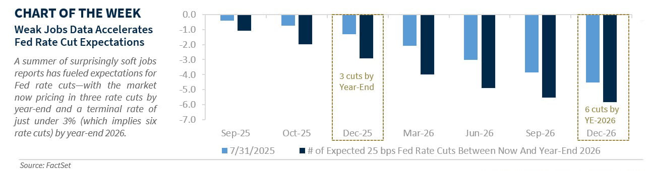 - A Fed Rate Cut Next Week Is A Near Certainty | Signs of weakness in the job market have started to emerge, leading Chair Powell to hint at possible rate cuts during his Jackson Hole speech in late August. Recent data has reinforced those concerns. Still, the Fed faces a balancing act—addressing those labor concerns while keeping an eye on a potential short-term bump in inflation.